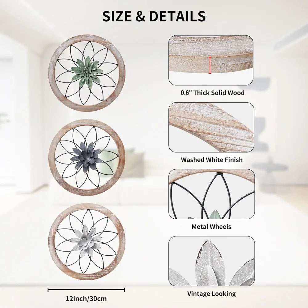 3 Piece Round Farmhouse Wall Decor with 6 Interchangeable Flowers Art
